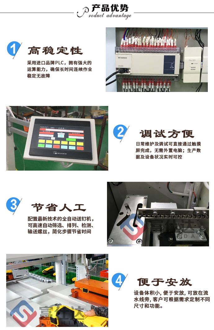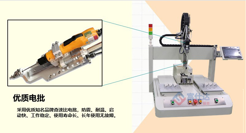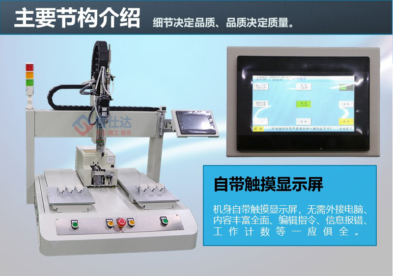 雙系統坐標式鎖螺絲機具有坐標式所有優點,不同的是雙鎖付系統采用兩臺獨立的自動送釘機和電批,分別用PLC控制各自電批的工作路徑,一臺設備可同時完成不同產品的螺絲鎖付工作,也可完成同一產品不同部位螺絲的鎖付工作,設備功能與普通坐標式自動擰螺絲機類似,搭配觸摸屏即可操作,可自行更改鎖付路徑。設備功能更完善。