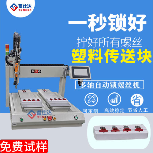 塑料傳送塊表鎖螺絲設備,產品是產品是用在工廠里面的設備上 正面有4顆螺絲需要緊固,背面也通過4顆螺絲緊固,